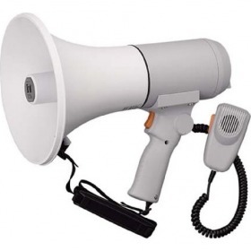 ハンド/ショルダー兼用メガホン 15W電源:単2形乾電池×6(別売)又は、 単3形乾電池×6(別売)電池持続時間:単2使用時/約13時間 単3使用時/約4時間通達距離:400m材質:ABS樹脂・マイクロホンが着脱自由なハンド型メガホンです。 マイクロホンをはずしてショルダー型としても使用できます。・ハンドル、マウスに抗菌処理を施していますので、衛生上、 安全に使用できます。・通常は単2乾電池を使用、アダプターを装着すると単3乾電池 でも使用することができ軽量化になります。