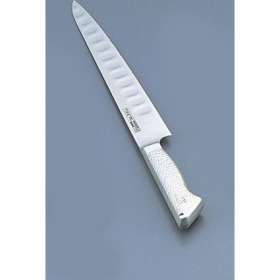 GLESTAIN グレステン(←ロゴ) 440Aをベースとしたグレステン鋼には、サブゼロ処理 (超低温処理)をはじめ、さらに何段階にもわたる特殊熱 処理を行っています。 耐蝕性、耐磨耗性、耐熱・耐寒性、靭性(強度)、硬度の 安定性(HRC58?59度)、切れ味の持続性など、 品質を徹底追求して高度な機能を実現。グレステンTMタイプの特長●へこみの部分に空気が入ることにより、刃離れの良さと、軽い切れ味を実現しました。●18-8ステンレスを使用した衛生的で耐久性の高いステンレスハンドル。●手入れが簡単でサビない、臭いもつかないので衛生的です。※包丁の表示サイズは、すべて刃渡り寸法となっております。