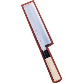 SA 佐文 青銅安来の青紙一号の鋼を使用し、切れ味の持続性に優れた最高の料理庖丁です。技術の年輪が開花したプロに贈る最高の舞台道具です。※このページの庖丁の表示サイズは、マチ付庖丁は刃先からマチまで、 マチなし庖丁は刃渡り寸法となっております。