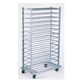 厨房内のスペースを最大限に活用●天板収納トンボラックは両面26枚、片面13枚の天板が 収納できます。(6,8枚取兼用)●フレーム間隔は各85mmで、天板の出し入れがスピーデ ィーに行なえます。●オーブンから出したばかりの食材の冷却用として御利 用ください。●φ100mmの大型キャスターで移動が楽です。フレーム:880×323フレーム間隔:85mm車輪φ100×4自在(2輪ストッパー付)※シルバーコーティング仕上●フレームは、一段おきに取り外しができますので、 背の高い食パン型も楽に収納できます。