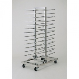 厨房内のスペースを最大限に活用●天板収納トンボラックは両面26枚、片面13枚の天板が 収納できます。(6,8枚取兼用)●フレーム間隔は各85mmで、天板の出し入れがスピーデ ィーに行なえます。●オーブンから出したばかりの食材の冷却用として御利 用ください。●φ100mmの大型キャスターで移動が楽です。フレーム:410×400 フレーム間隔:85mm車輪φ100×4自在(2輪ストッパー付)