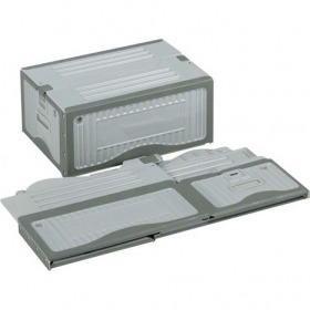持ち手穴無しタイプ特長 (1)折りたたみ薄さが32mmと業界最薄。 (2)手に持ったソフト感とデザイン性において、どなたでも非常になじみ易い容器形状。 (3)肉厚を最大限薄くしている為、有効容積は90%。より狭いスペースでの使用に効力を発揮します。(従来品折りコン:約75%) (4)ボトムロック方式採用により、ワンタッチにて組み立て・折りたたみが可能。