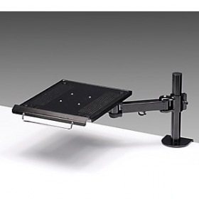 机上空間を有効活用。サブマシンの設置に適しています。使うときには手前に、使わないときはデスク奥へと簡単に移動させることが出来ます。ノートパソコンを載せる棚板は30度まで調節が可能です。棚板の位置は机上面から80-280mmで調整が可能です。デスクへの取り付けはクランプ式になっており、15-100mmの天板に取り付けることができます。